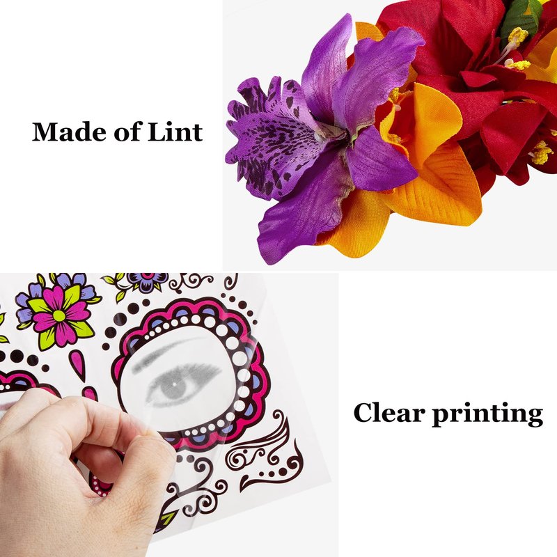 - Material : The Day of the Dead headpiece is made of high-quality cloth, and headband has the elasticity, it won't affect the hairstyle; the face tattoos are harmless and safe for your face, waterproof and sweat-proof, which may last for 3-5 days