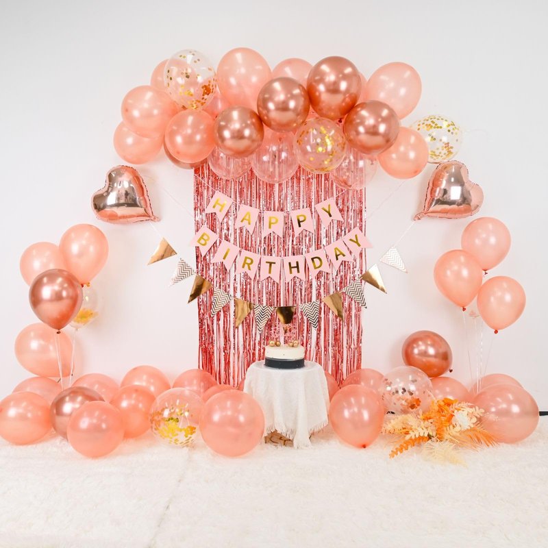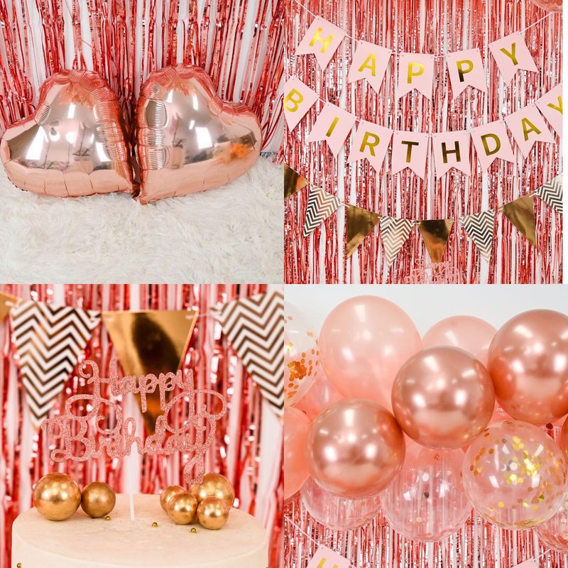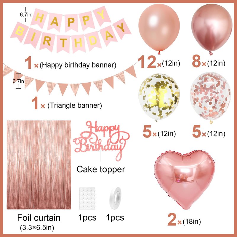 - ROSE GOLD BIRTHDAY DECORATION KIT INCLUDES: 32pcs latex balloons (rose gold balloons,metallic rose gold balloons,rose gold confetti balloons,gold confetti balloons balloons),1pcs rose gold "Happy birthday" Banner,1pcs rose gold fringe curtain background (2 meters),1 triangle bunting,1 rose gold birthday cake topper,2pcs rose gold foil heart balloon,1 glue,1ribbon.