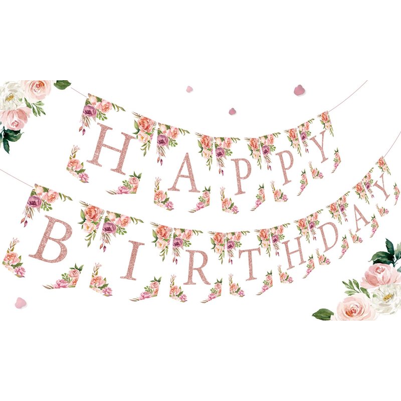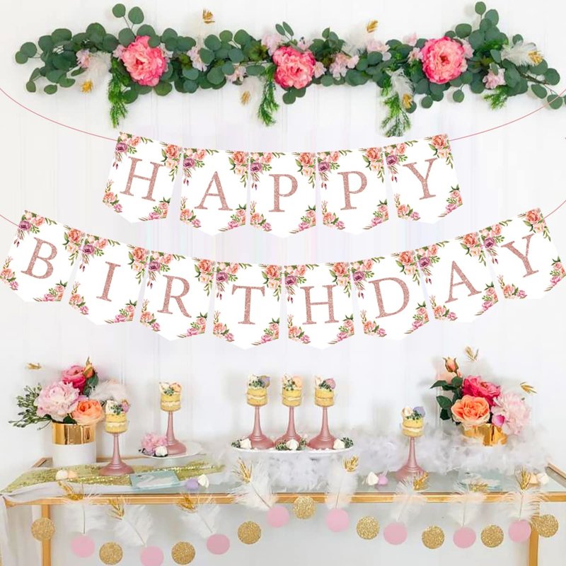 Rose Gold Floral Birthday Decorations for Women Girls - Floral Theme Glittery Happy Birthday Banner for Home Wall Mantel Window Birthday Party Supplies
