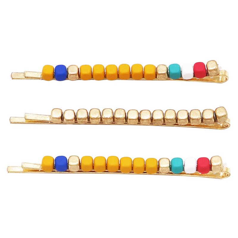 - Set of three decorative fashion bobby pins for hair with squared chunky nugget beads in matte gold, yellow, blues, white and red. Comfortable yet durable beaded hair clips.