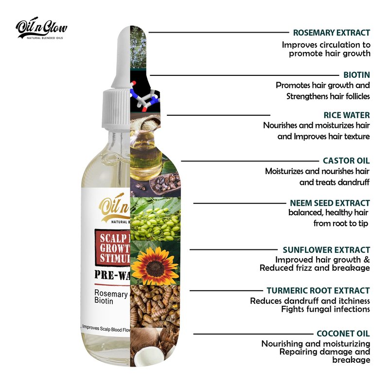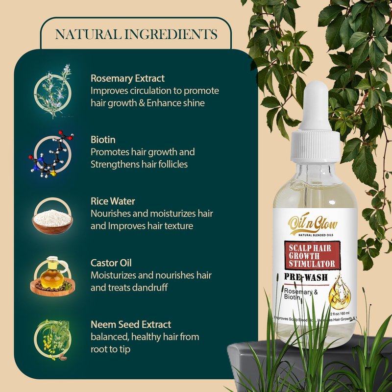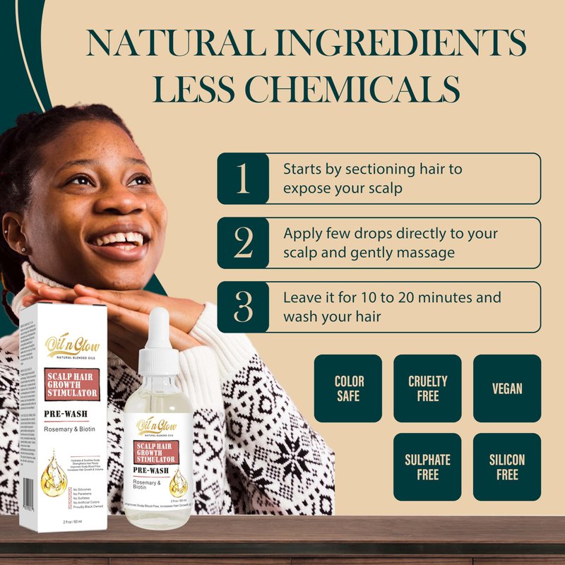 - For Hair Types: Oilnglow’s Rosemary pre-wash hair Oil for hair growth suits all hair types. It is a hair serum treatment integrating seamlessly into any hair care routine, addressing dry, itchy, or flaky scalps and scalp build-up, nourishing the scalp before shampooing.