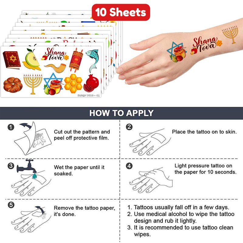 - 🎉 [GREAT GIFT IDEAS FOR ROSH HASHANAH PARTY SUPPLIES DECORATION]: You will receive many compliments when you decorate your child’s Rosh Hashanah celebration. Rosh Hashanah tattoos are a small gift you should not pass up for your kid.
