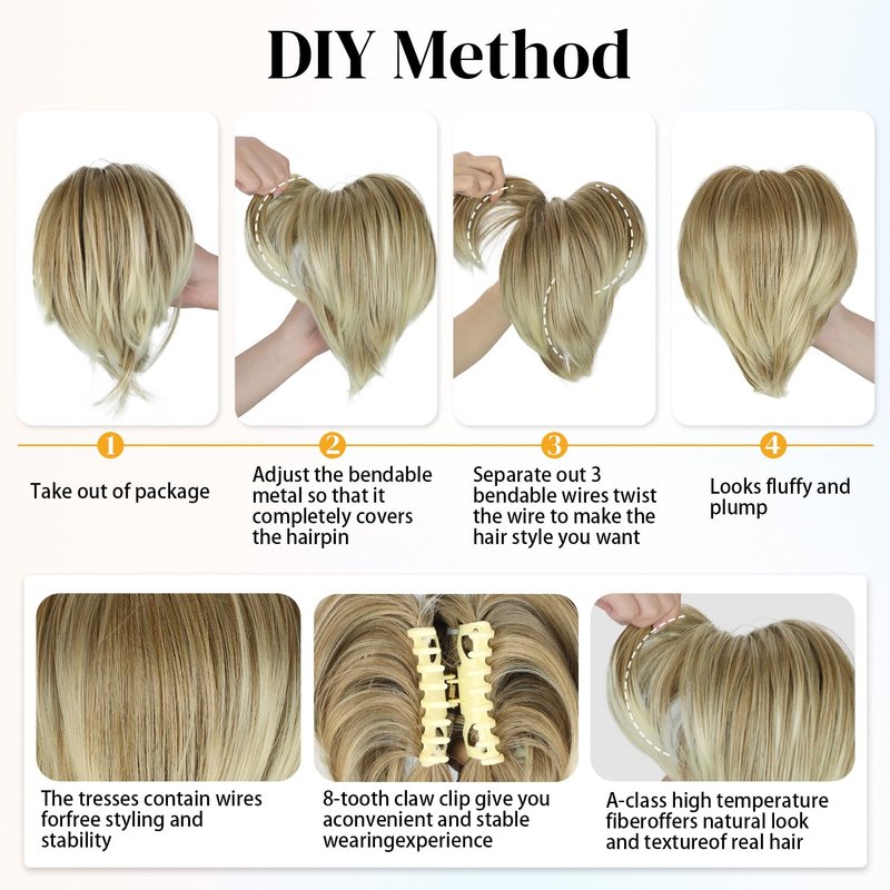 Our claw clip messy bun hair piece short ponytail extension with 3 bendable metals wires made of high quality heat-resistant synthetic fiber, this messy bun hair piece is soft-touch, bouncy, and more invisible. The 8-tooth claw clip ensures secure placement all day long. Weighing about 3.5 ounces, this claw clip ponytail bun hair piece with bendable metal offers a bit more weight for a natural look.
