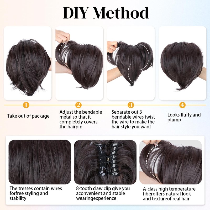 Our claw clip messy bun hair piece short ponytail extension with 3 bendable metals wires made of high quality heat-resistant synthetic fiber, this messy bun hair piece is soft-touch, bouncy, and more invisible. The 8-tooth claw clip ensures secure placement all day long. Weighing about 3.5 ounces, this claw clip ponytail bun hair piece with bendable metal offers a bit more weight for a natural look.