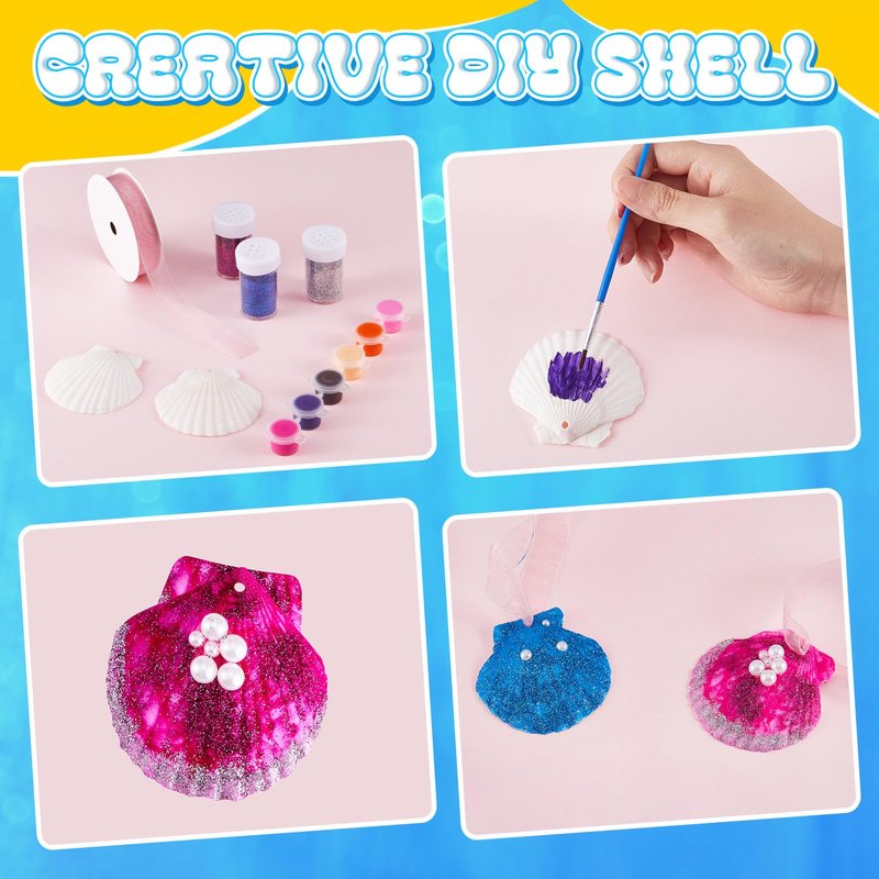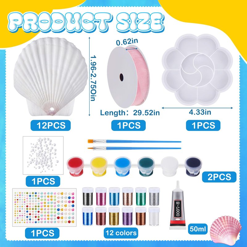 - Comprehensive Set for Crafts: our shell craft kit includes everything you need to unleash your imagination; With 12 seashells, 100 faux pearls, 12 bottles of glitter powder, 2 packs of acrylic paints (each includes 12 colors of 3 ml acrylic paints and 2 paint brush) with 1 color palette, 1 roll of chiffon ribbon, 1 sheet of pearl sticker, also 1 glue, your seashell jewelry making needs are fully covered