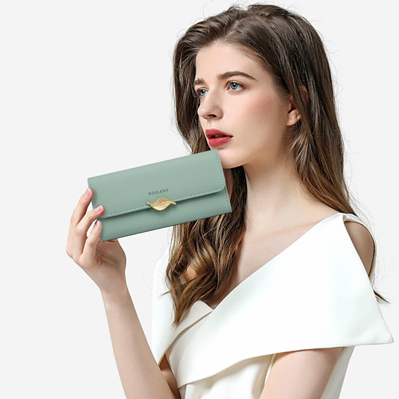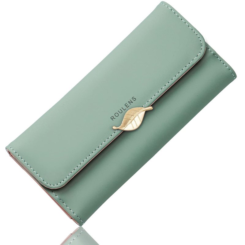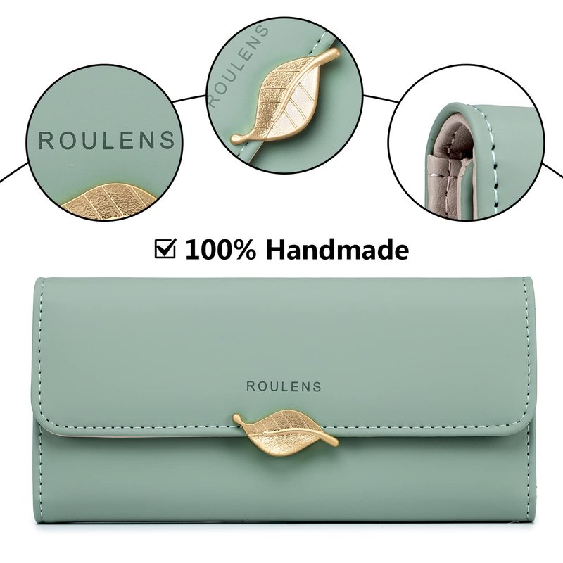 Roulens Wallet for Women RFID Blocking PU Leather Leaf Pendant Card Holder Phone Checkbook Organizer Zipper Coin Purse