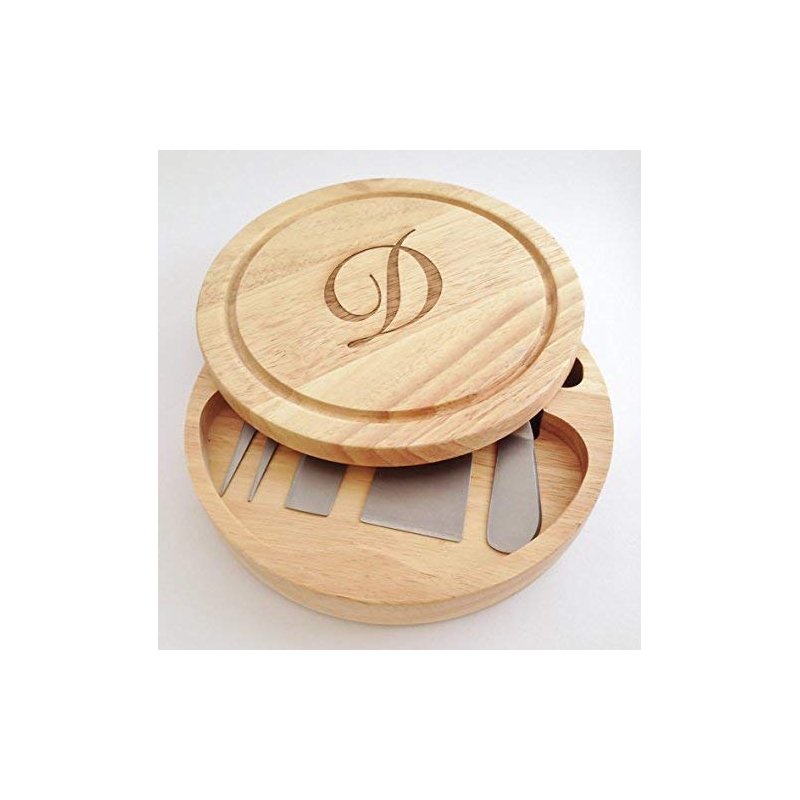 Round Cheese cutting board with tools inside. Customize with a letter, monogram or name. 8.75" diameter, 1.75" thick