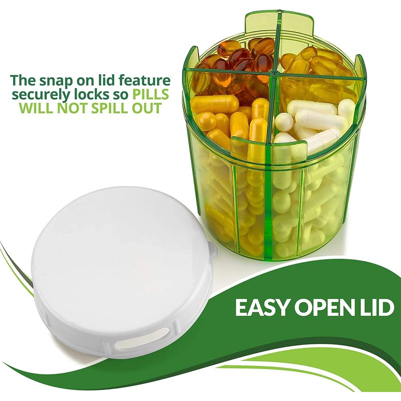 - EASY OPEN LID: The snap on lid feature securely locks so pills will not spill out. Featuring a twist top thats versatile and easy to load giving you easy access to your desired compartment. So you can avoid mixing up your medications and be more organized all the time! Filling is easy but you'll love your new medication dispenser because you will not have to refill it as frequently as other weekly pill organizers and its travel friendly!