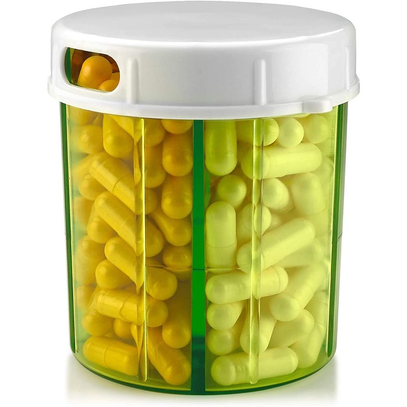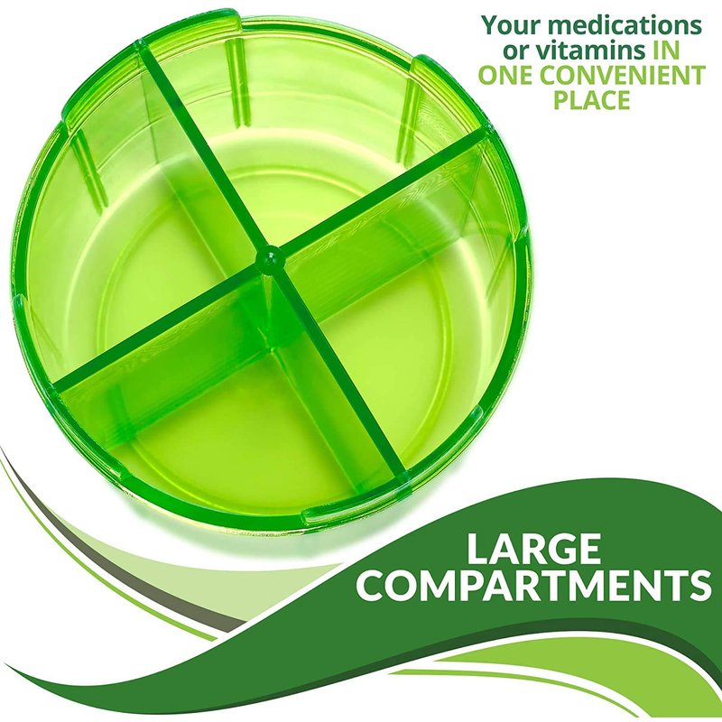 - FOUR LARGE COMPARTMENTS! GREAT FOR BULK VITAMIN STORAGE: If you've been looking for a bulk pill planner to organize your vitamins and supplements in one place, then your search is over. With our Round 4 Compartment Pill Organizer now you can leave your weekly pill organizers in the past and hold each of your vitamins or medications all in one place and avoid mixing up your medications when taking your pills for the day