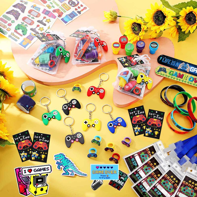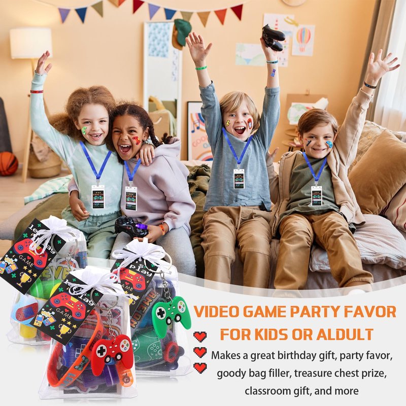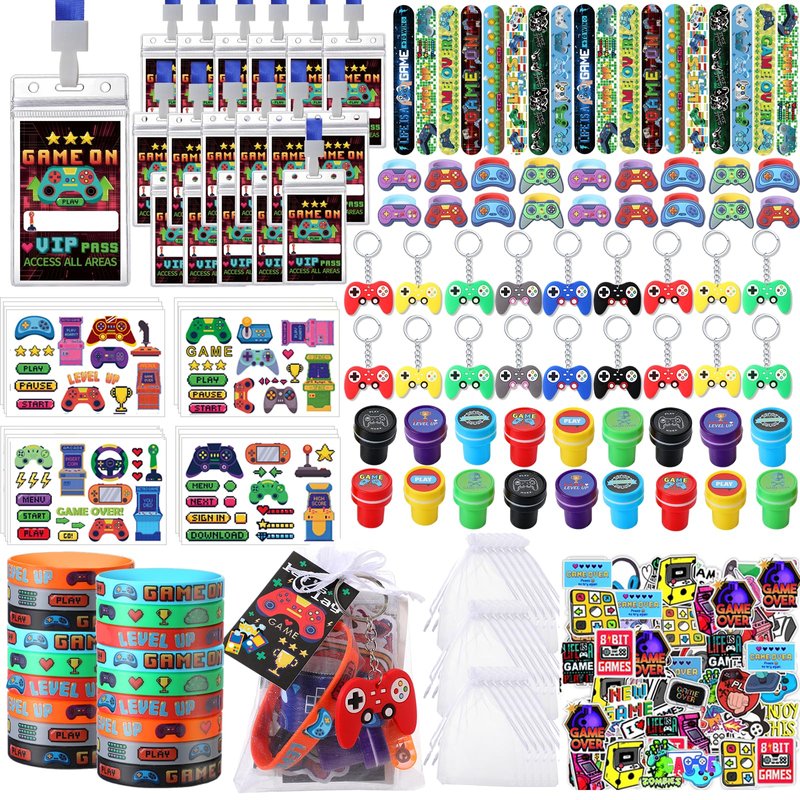 - Ideal Gamers' Gift Combo: video game party favors pack is a veritable treasure for video game lovers; The package caters to fans' tastes with its rich combinations and cool game styles; It includes 18 x Badge holders; 18 x Keychains; 18 x Slap bracelets; 18 x Gift tags; 1 Bag of gaming stickers (50 pcs); 18 x Stampers; 18 x Tattoos stickers; 18 x Silicone wristbands; 18 x Mesh bags; 18 x Silicone rings