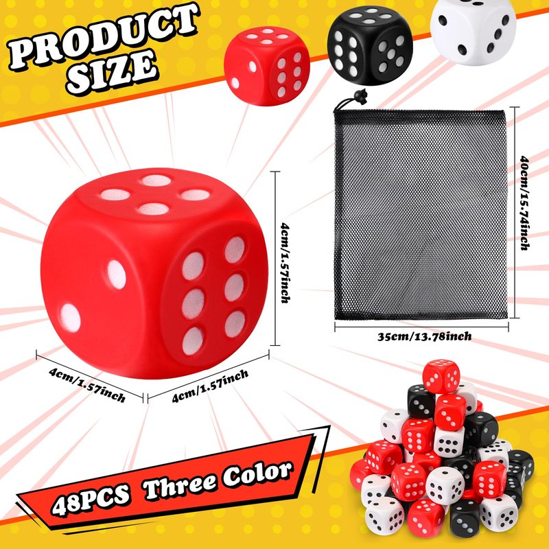 RoundFunny 48 Pcs Foam Dice Stress Ball 1.57 Inch Fake Soft Slow Dot Dice Stress Anxiety Relief Dice Toys for Kids Adults Board Game Themed Decoration Party Pool Toy Favors School Supplies
