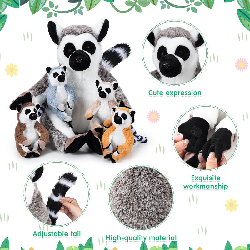 - Mommy and Baby Stuffed Toy Set: you will get 5 pieces of lemur plush toys, including 1 piece of large lemurs and 4 pieces of small lemurs in 5 different colors, lovely and exquisite, meet most people's color preferences; Due to the vacuum packaging, it can be left for a while when received and the realistic lemur can be seen