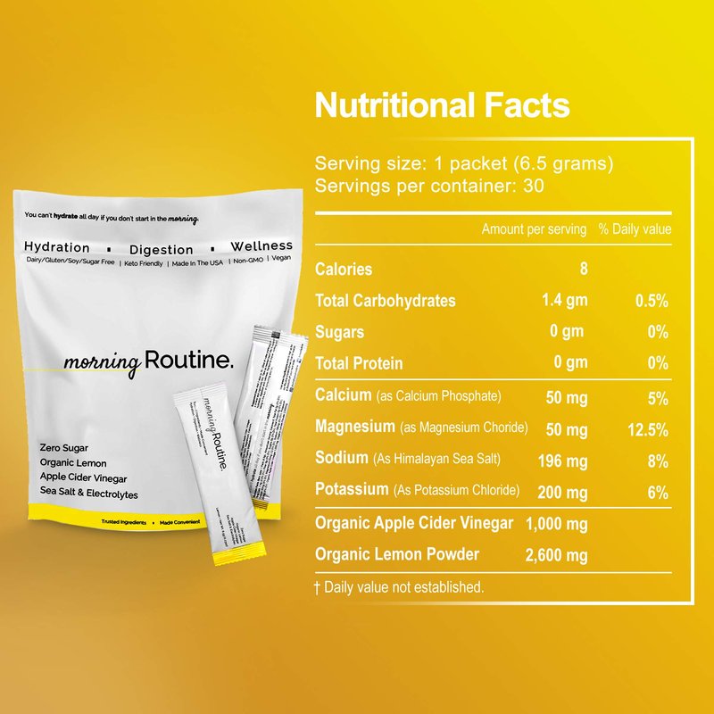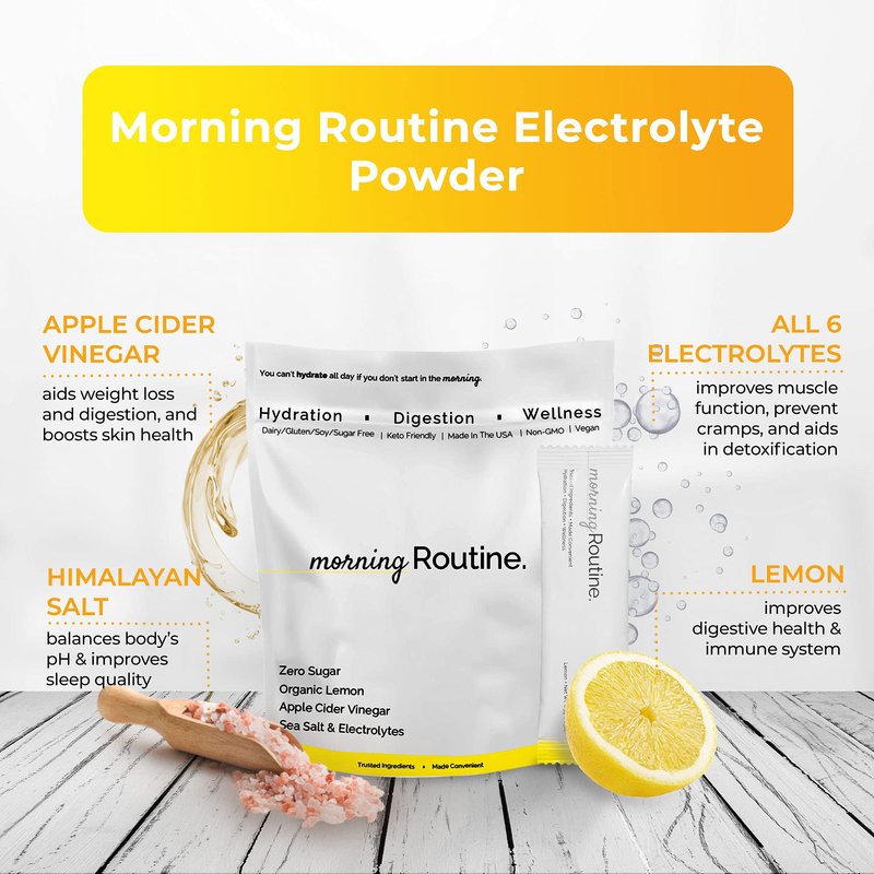 - ACV, LEMON, SEA SALT, & ELECTROLYTES - Morning Routine is the ONLY hydration packets on the market that combines organic lemon, organic apple cider vinegar, himalayan sea salt, and electrolytes. It works as an electrolyte water supplement or as a sugar free hydration packets to support daily hydration
