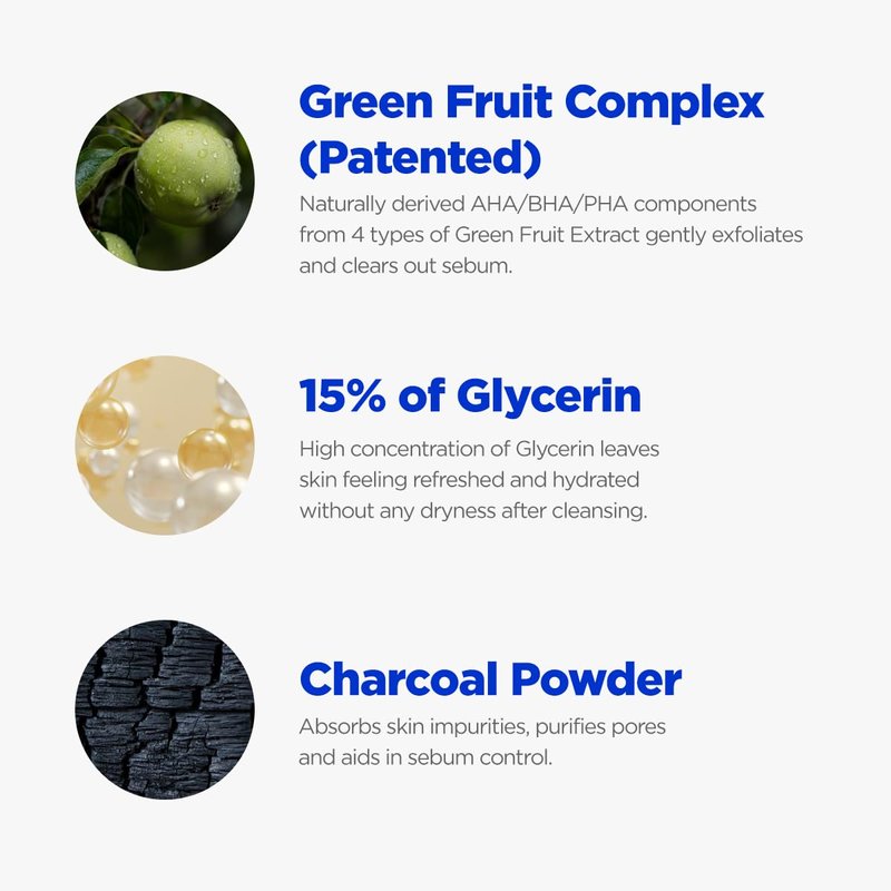 - Active Ingredients: Green Fruit Complex(patented):Naturally derived AHA/BHA/PHA components from 4 types of green fruit extract including green papaya, gently exfoliates and clears out sebum. Helps increase the natural moisturizing factor for a soft, fully hydrating, and highly effective cleansing experience.