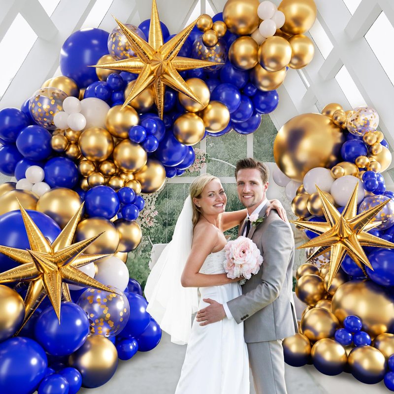 - Package Includes:The blue and gold balloon arch kit includes 42pcs royal blue balloons 18inchx2, 12inchx10, 10inchx10, 5inchx20, 42pcs metallic gold balloons 18inchx2, 12inchx10, 10inchx10, 5inchx20, 20pcs white balloons 10inchx10, 5inchx10, 12inch gold confetti balloonsx8, 22inch gold foil balloonsx3, glue dotsx60, ribbonx1, decorative stripx1