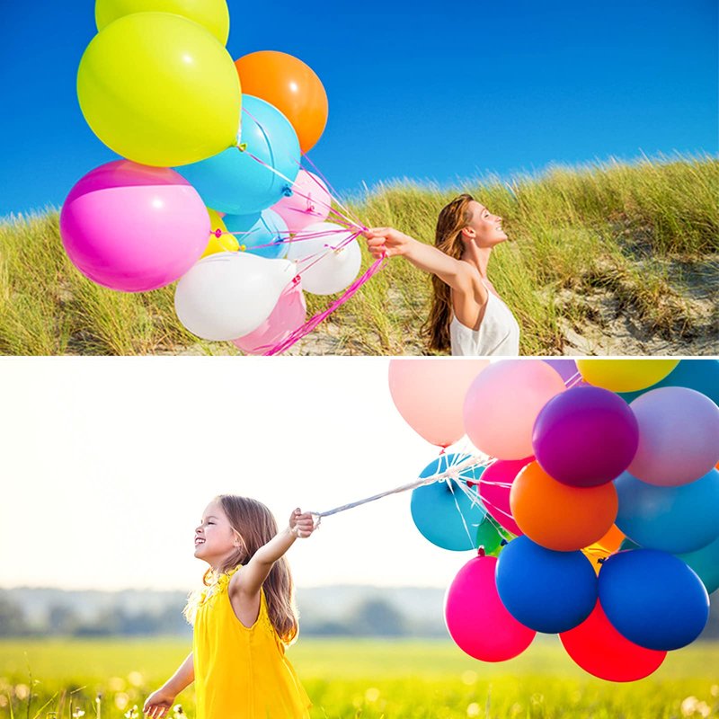 - The blue party balloons kit contains 5 different latex balloons, namely 12 inch Royal dark blue balloons, bright pearlescent light blue balloons, soft Baby Blue balloons, pearl white balloons and Blue Confetti balloons, they are all 12 inch thick latex balloons. You can use the ribbon provided in the balloon package to keep the balloons linked together.