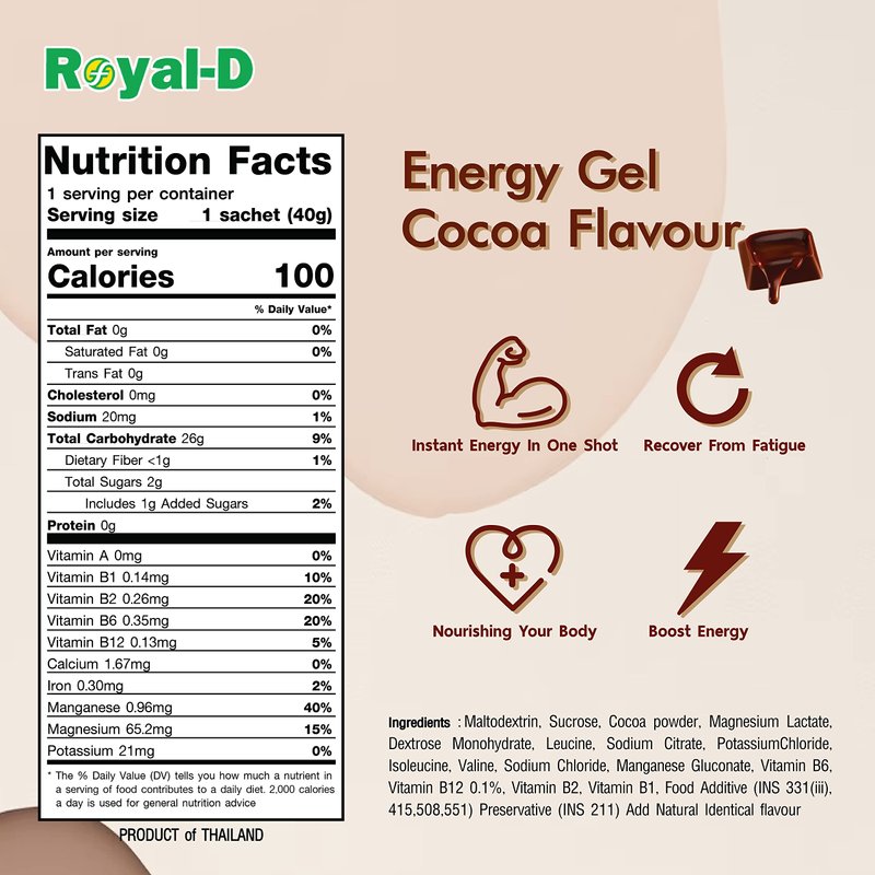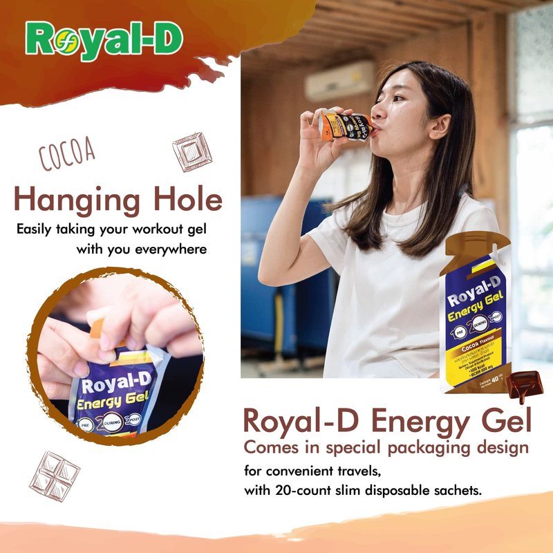 - One-Shot Energy Boost Just tear and take—Royal-D Energy Gel gives you a fast energy shot with delicious cocoa flavor. Ideal for pre- or mid-workout fuel, whether you’re running, cycling, or hitting the gym.
