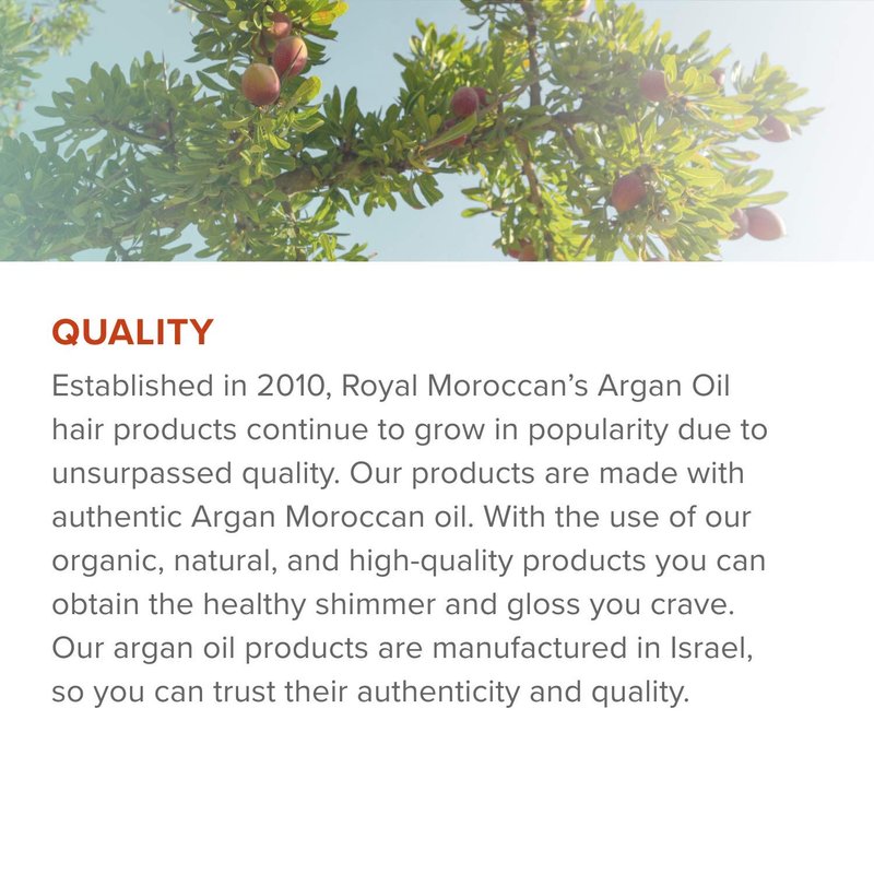- ROYAL MOROCCAN ARGAN OIL QUALITY: Royal Moroccan's Argan Oil Hair Products continue to grow in popularity. Our purple shampoo is made with authentic Moroccan Argan oil, with continued use of these organic, natural products they will give your hair a healthy shimmer and gloss you crave. Our argan oil products are manufactured in Israel, so you can trust the quality.