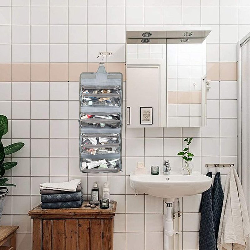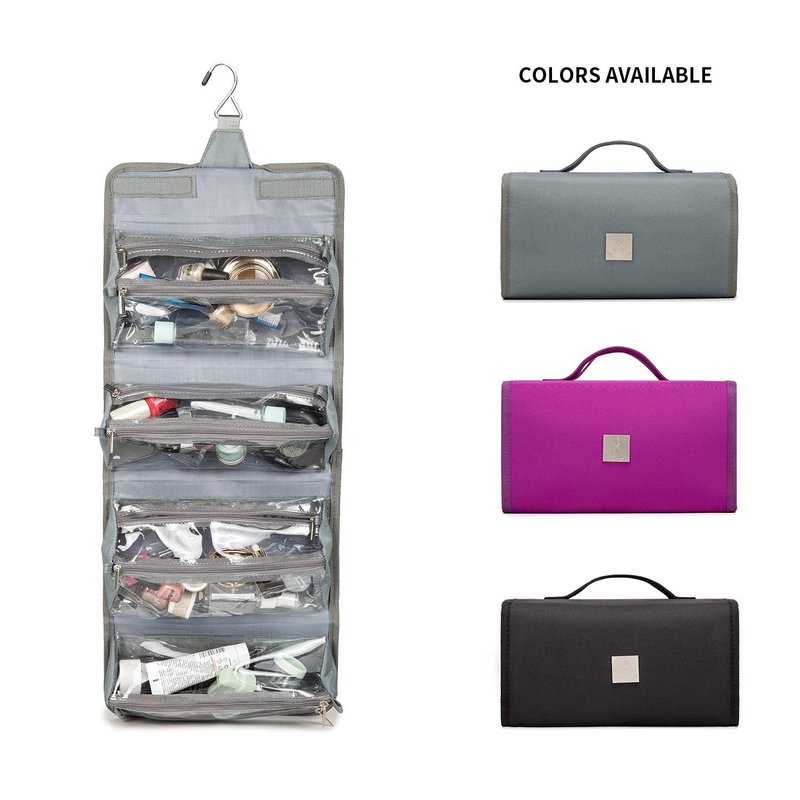 ROYALFAIR Roll Up Makeup Bag, Travel Toiletry Bag for Women with 4 Clear TSA Approved Pouches, Hanging Travel Organizer, Folding Cosmetic Bag for Men and Women (Grey)