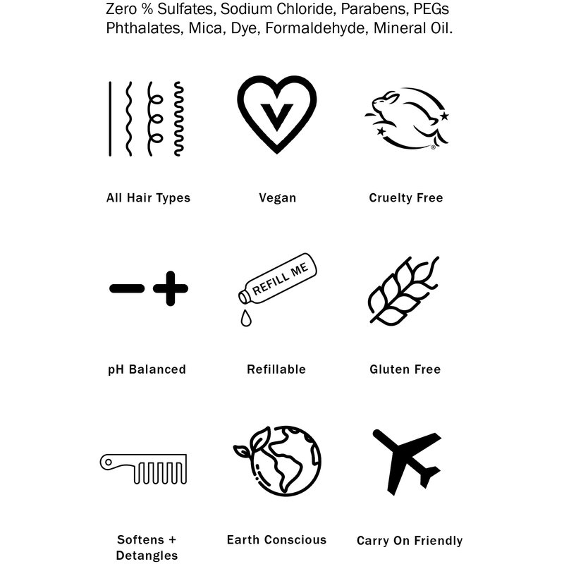 - 0% sulfates, sodium chloride, PEGs, parabens, phthalates, gluten, dye, mineral oil. Vegan + cruelty free. Not tested on animals. Leaping Bunny Certified.