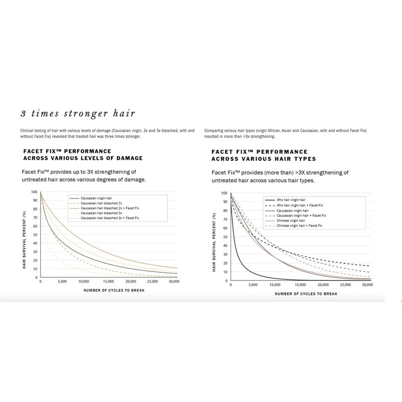 - Facet Fix patented bond builder repairs at a molecular level; it strengthens internal hair structure up to 3x that of untreated hair, creates additional hydrogen and ionic bonds within the hair’s keratin structure, penetrates deep into the cortex and restores fiber strength to levels of virgin hair. Plant based + sustainably sourced.