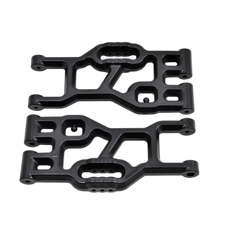 Overview: RPM Front and Rear A-arms for the Associated MT8 are designed to improve durability over stock A-arms. How did RPM do it? First, by increasing the amount of material surrounding the inner hinge pins by 7%, then increasing the width of that thicker diameter by nearly 40%! RPM then increased the amount of material at the outer hinge pins by 28%! RPM also increased the width there too, by another 9%. The support beams on RPM A-arms also got beefier. At their thickest, stock a-arms are roughly 1/2” (12.7mm) thick, but taper down on both ends. That amounts to a loss of nearly 30% of their thickness at the outer hinge pins. Not with RPM! RPM A-arms are a full 1/2” (12.7mm) over nearly their entire length! RPM only tapers them slightly at the inner hinge pins (.45” or 11.43mm at their narrowest) to match the maximum size allowable of the inner hinge pin bosses. To compensate for that slight taper, RPM uses four massive support beams instead of two, making RPM MT8 A-arms the toughest alternative to stock available! All RPM A-arms are molded from RPM's nearly indestructible blend of engineering grade nylons for performance you can trust.