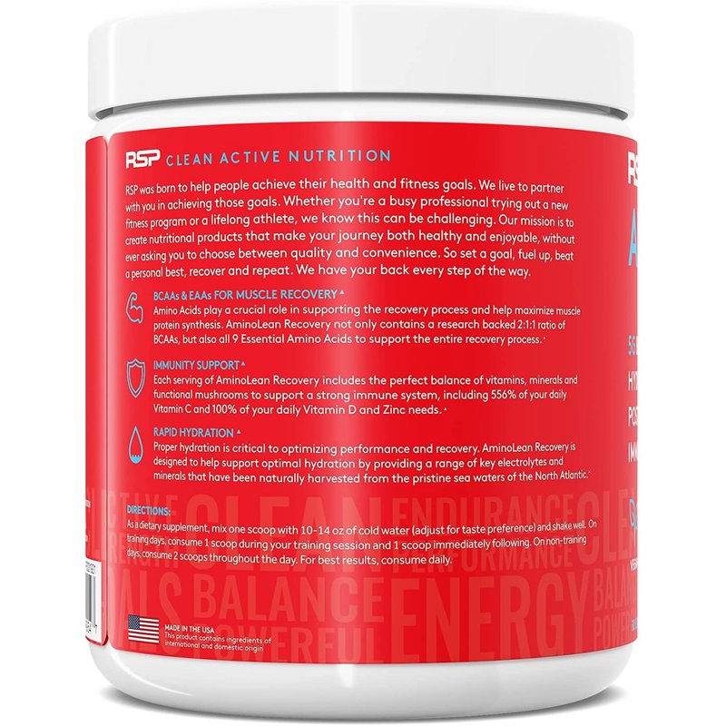 AminoLean Recovery contains a complete spectrum of vegan amino acids for post workout & muscle recovery. It includes a proven 2:1:1 ratio of BCAA amino acids plus all 9 Essential Amino Acids to support the entire recovery process. Rapid hydration support from a unique blend of natural electrolytes and 72 trace minerals that are easily absorbed by the body and used to replenish the electrolytes & minerals lost through sweat. Whether you're looking for an immunity boost post workout or just extra daily immune support, AminoLean Recovery features Vitamin C, Vitamin D, Zinc & Reishi Mushroom to support a healthy immune system & optimal recovery. AminoLean Recovery is vegetarian friendly, sugar free and contains no artificial colors. Perfect intra workout or post workout recovery drink. Take on non-training days to optimize recovery.Perfect intra workout or post workout recovery drink. Take on non-training days to optimize recovery.