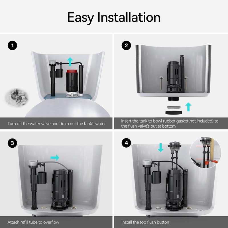 - 【Easy Installation & Adjustment】Easy installation without tools. Adjustable overflow tube to fit different tank heights(11.22"-15.15"), half and full water level adjusters to control water consumption.