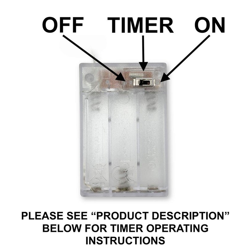 TIMER FEATURE: When used with new batteries they last for over 48 hours on constant "ON" mode and over 14 Days on "TIMER" mode (6 Hours ON and 18 Hours OFF). TIMER MODE - Move the switch to the middle under “ TIMER” position to activate Timer Function at the time you want lights string to come on each day. Your lights string will glow for 6 hours then Turn Off automatically for 18 hours. It will Turn On and Turn Off at the exactly same time you set it for 6 hours On and 18 hours Off again every day. Press “ON/OFF” button to deactivate TIMER mode.