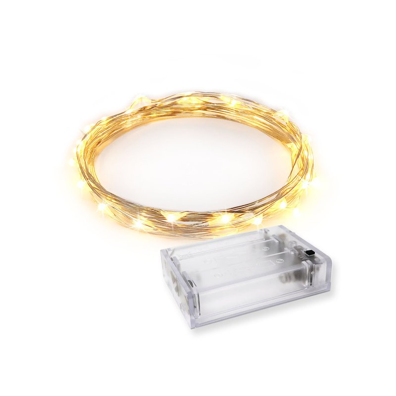 - EXTRA LUMINOUS: 30 Super Bright Warm White Color LED Lights on 8.5 feet ultra thin silver color wire for indoor and outdoor use. There are 4 inches distance between LED bulbs and 12 inches clear cable between the wire and the battery box. TOTAL STRING LENGTH IS OVER 9.5 FEET.