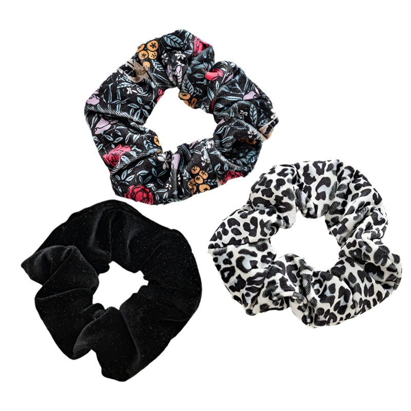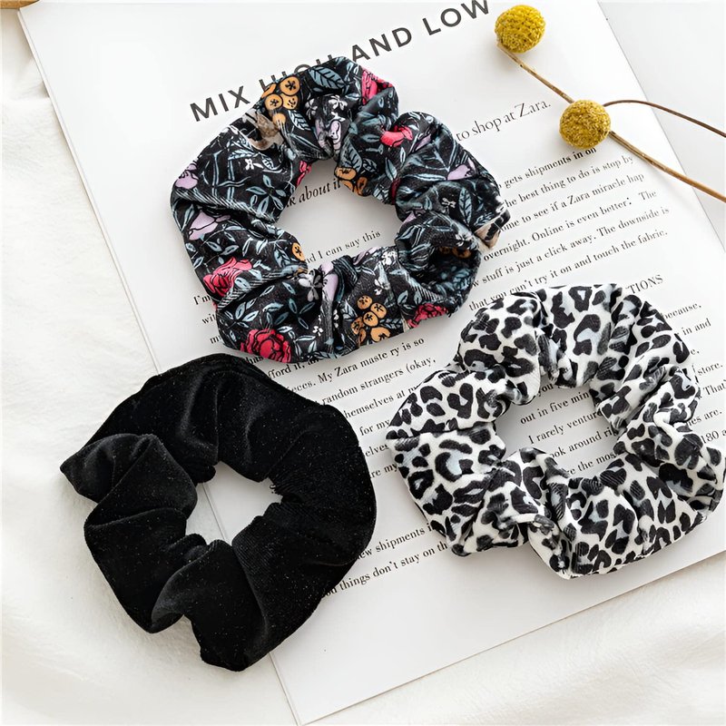 - PACKAGE INCLUDED:3 Packs Black Set Velvet Scrunchies, Simple Black, Flower, Leopard