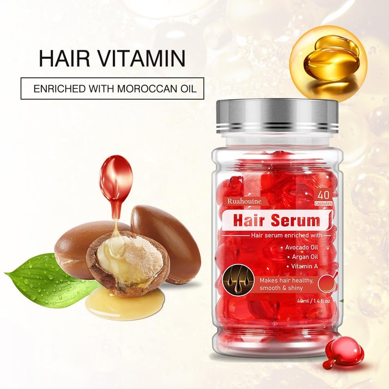 Ruahouine Hair Styling Serum Oil for Frizzy & Dry Hair, Hair Treatment Serum - no Rinse with Argan Macadamia & Avocado Oils - Vitamins A, E, Pro B5 - Conditioner for Women & Men 40 Capsules