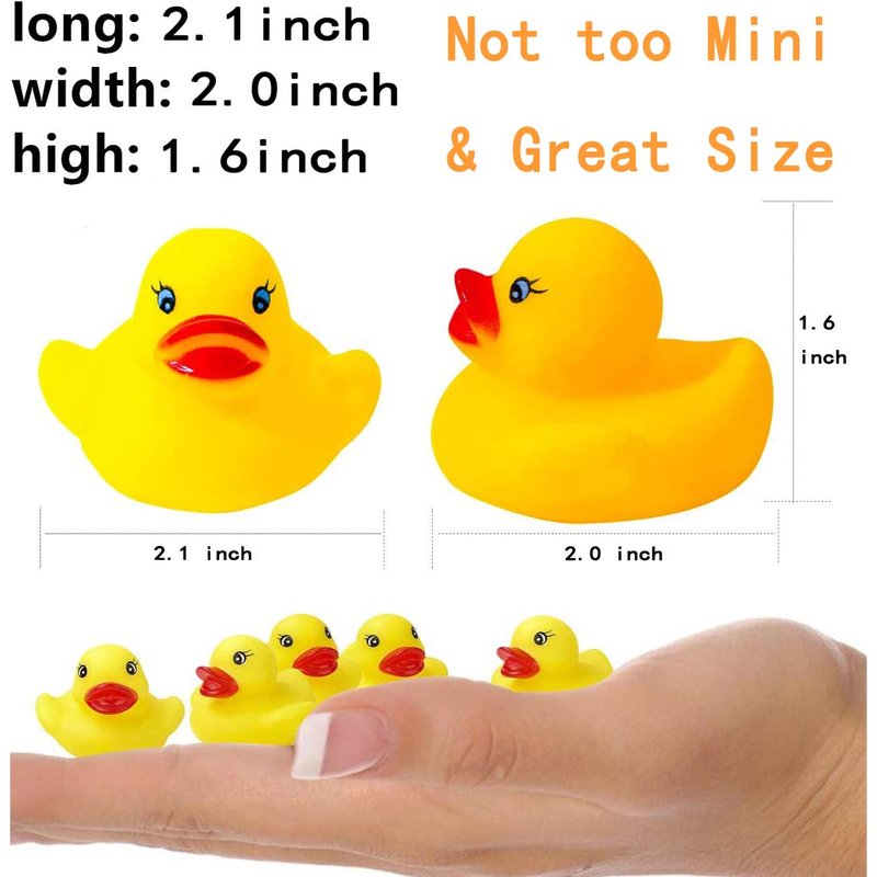 💖Mini Rubber Duck Bath Toy Baby Bulk Baby Shower Birthday Decorations Party Favors Gift, Set of 50 💖Unisex- children's joy, love toys, great bath toy, you can let your baby in the bath while enjoying the fun of the game, so the bath becomes happy! Package Includes: 50 Pieces Mini Rubber Ducks Each Ducky Measure: 2.1'' x 2.0'' x 1.6" (Bottom L x H x W) 💖 Warm Tips: 💖Use it for the first time, please wipe it with a wet cloth to remove any dirt or left the rubber toy to soak. 💖I wish the children a happy life.