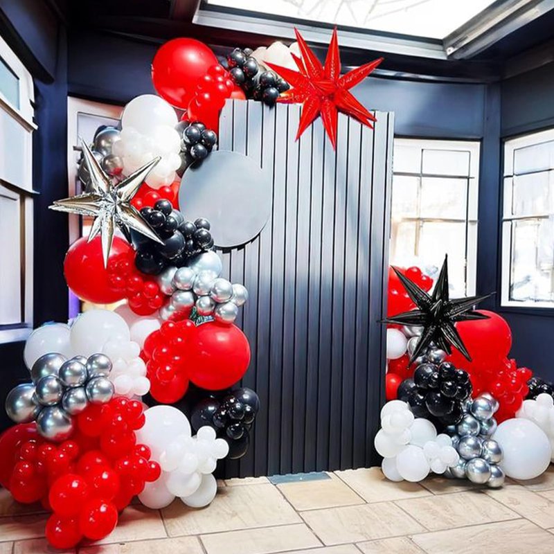- [All-in-One Kit] This balloon kit includes everything you need to create a stunning decoration, 25 black balloons, 20 red balloons, 15 white balloons, 5 black and red confetti balloons, and 2 rolls of black and red ribbons. The size of the balloon is about 12 inches after inflation. The combination of black and red can make any party or event more fashionable.