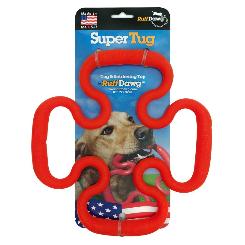 RuffDawg Tug Dog Toy Some tug toys can be damaging to your dog’s teeth, if the game gets ruff enough. The indestructible, clover-shaped RuffDawg Tug is easy to grab from any angle, and it’s easy on the mouth in a bouncy, flexible material. Built for interaction—you with Dog, or Dog with a canine playmate. Features: · Buoyant · Tear- and puncture-resistant · Rugged and flexible · Kind and gentle to doggie teeth and gums · Encourages exercise and interactive play · Non-toxic · Made in USA · Available in a range of cool, high-energy colors; please allow us to select Item Specifications: Size: Super Tug (9”L x 9”W x ¼”H) Mini Tug (5 ½”L x 5 ½”W x ¼”H) Color: Assortedw