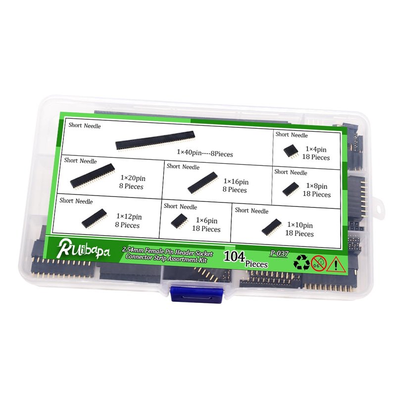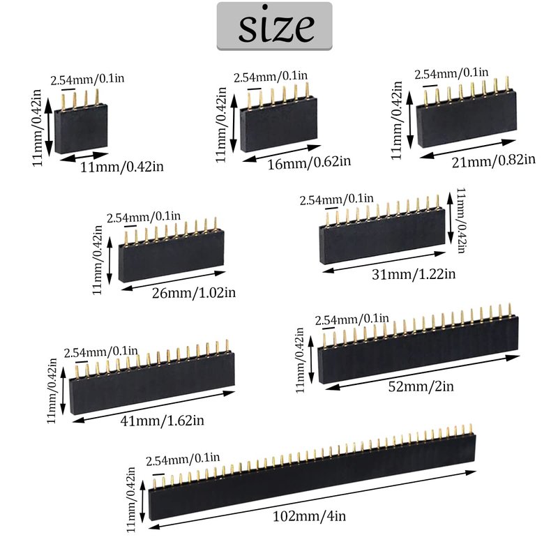 - Package: 104pcs female connector includes 18pcs-1x4 pin, 18pcs-1x 6 pin, 18pcs-1x 8 pin, 18pcs-1x 10 pin, 8pcs-1x 12 pin, 8pcs-1x 16 pin, 8pcs-1x 20 pin and 8pcs-1x 40 pin.