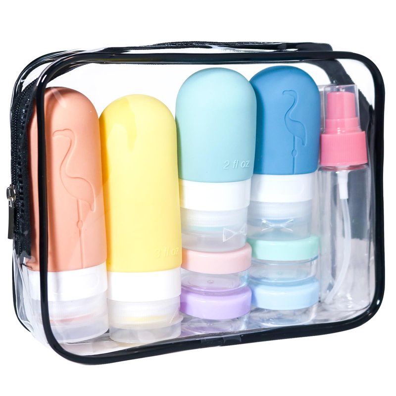 - ★:Package Contents: Travel bottle set includes 4 travel bottles, 4 travel jars, 2 spray bottles, 2 spoons, 1 small funnel, 1 small dropper, 1 cleaning brush and 1 label, and 1 A transparent black cosmetic bag. Diverse containers can carry different toiletries and cosmetics according to your needs.