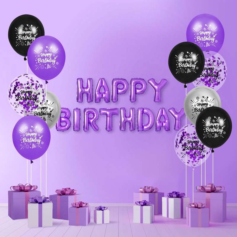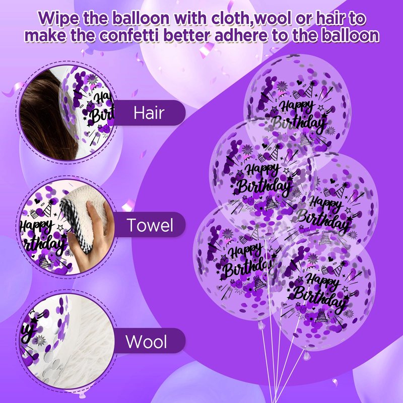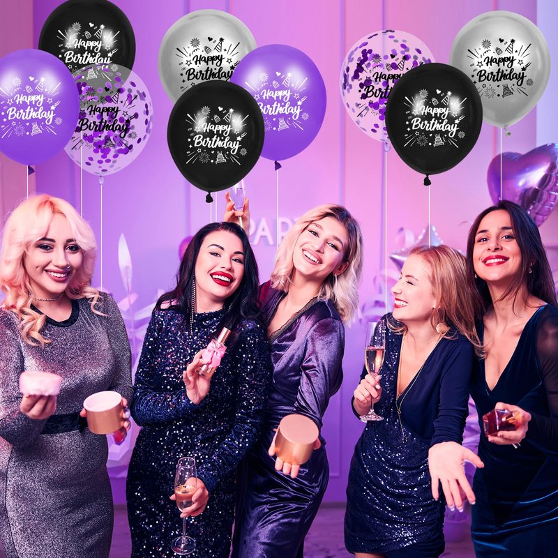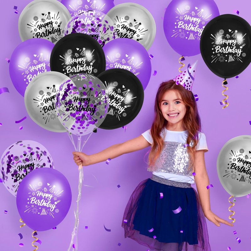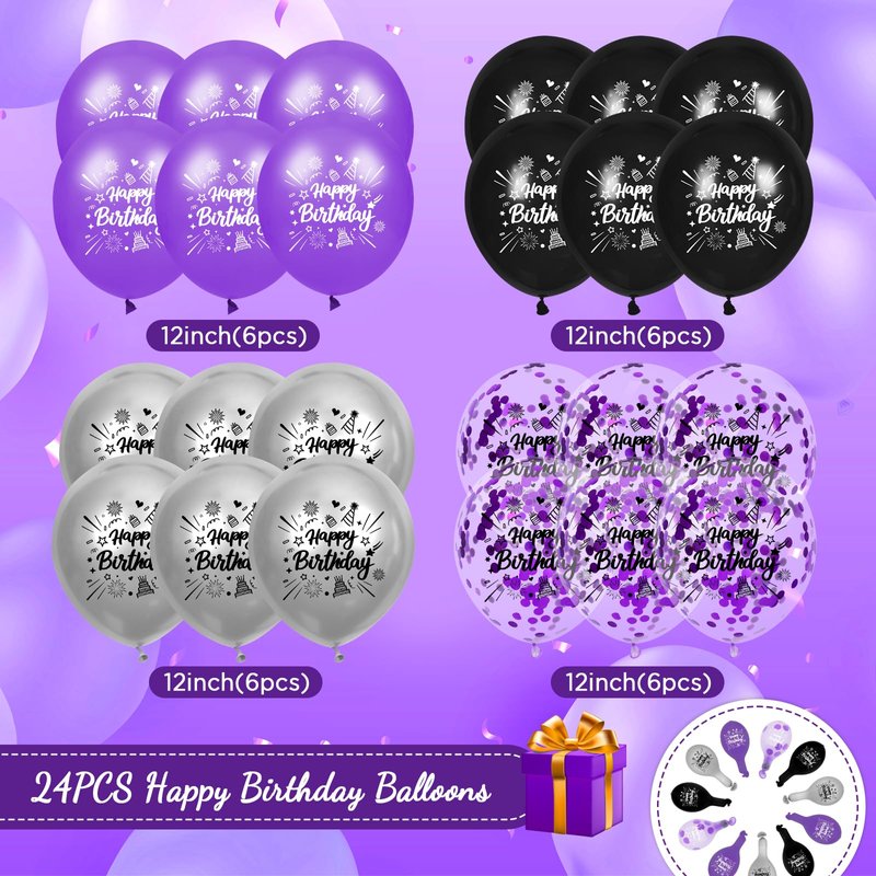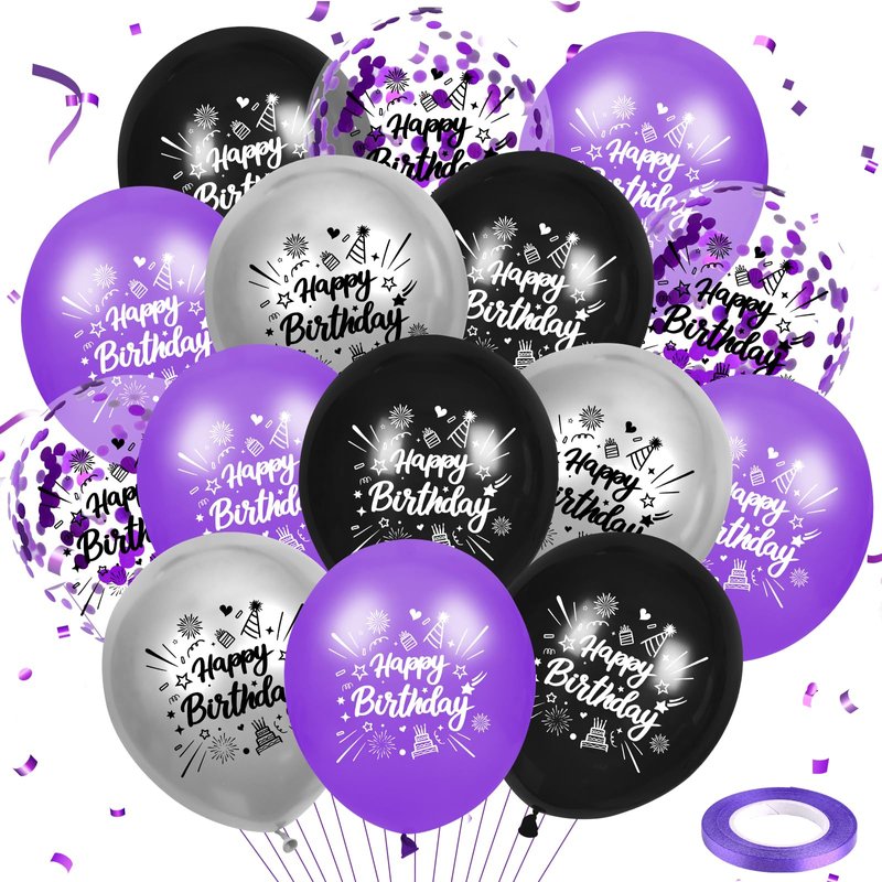 RUMIA Purple Birthday Balloons 24Pcs Purple Black Silver Happy Birthday Latex Balloons Confetti Balloons with Ribbons Set for Girls Women Men Birthday Anniversary Party Decorations Supplies 12 inches