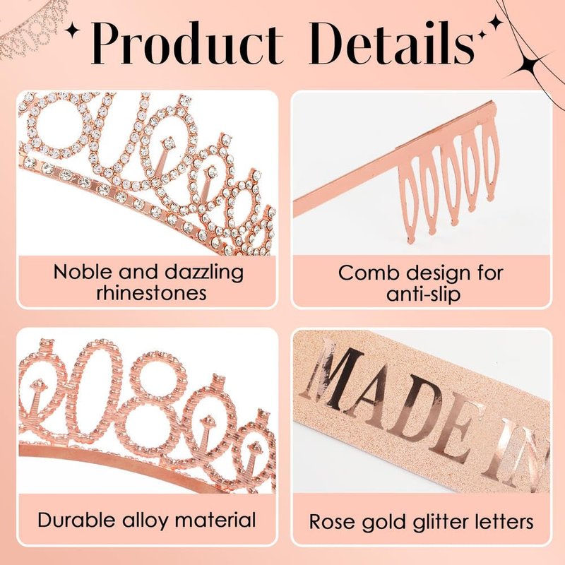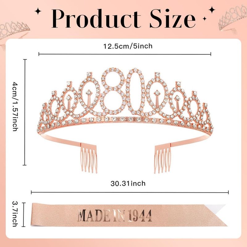 - 【Durable Material】The rose gold 80th birthday crown in our set is made of rhinestones and alloy, which is sparkling and durable. The birthday sash is made of fabric and features "Made in 1944" in sparkling rose gold.