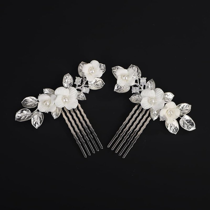 Rumtock 2pcs White Flower Silver Leaf Hair Comb Set for Wedding Brides Women Handmade Boho Jewelry