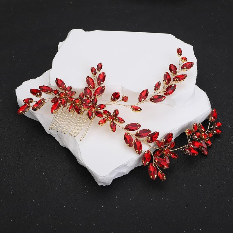 Rumtock Red Crystal Beads Long Hair Comb Handmade Gold Hair Piece for Women Girls Wedding Bridal Hair Accessories (Red)