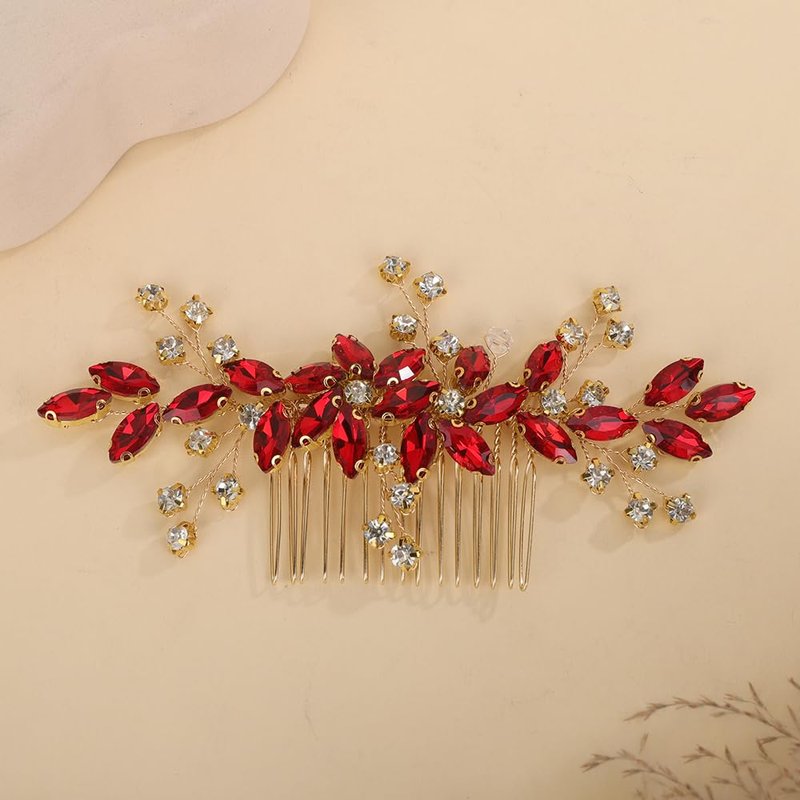 Rumtock Red Rhinestones Side Headpiece for Women Handmade Hair Comb with Crystal Handmade Long Hair Accessories (Red)