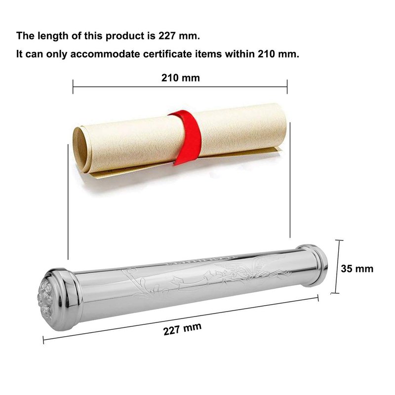 - ❉ Baptism Certificate holder made of zinc alloy environmentally friendly material. Birth certificate Holder size: 227X35X35mm (8.93"X 1.38"1.38"). Base:83*47*46mm (3.27"X1.85"X1.81"). A set weight:535g (1.18bs). Storage length 8.9”(approximately). Diameter: 1"(approximately).