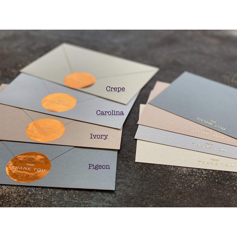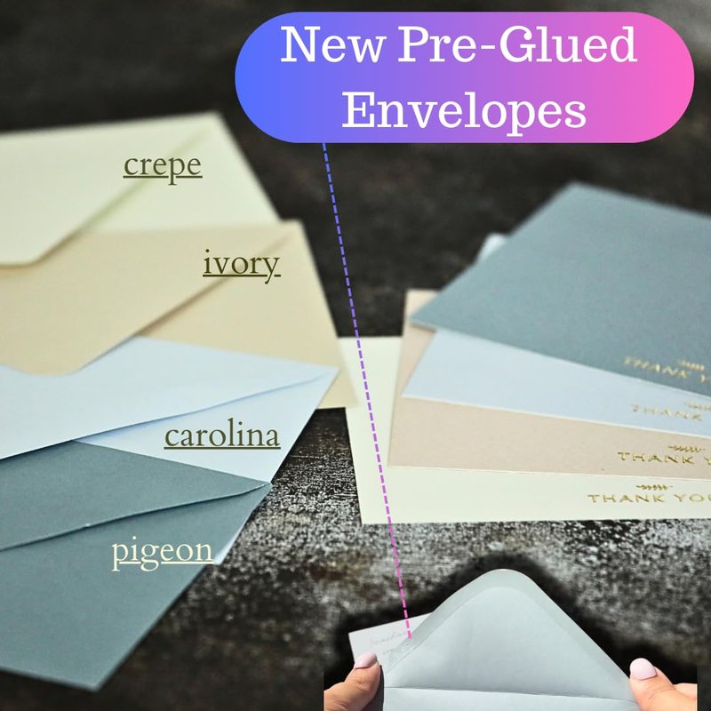 - ALL IN ONE PACK - Set includes 9 flamingo, 9 blush , 9 ivory, 9 crepe color cards and 36 pre-glued envelopes, 36 thank you sticker. Cards measure 4 inch x 6 inch.