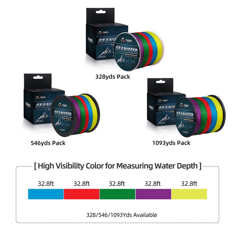 - Size Information: The braided fishing line is 8 strands, which has 5 colors and 32.8ft per color. The five colors are sorted in turn, and the total length has three choices of 328/546/1093YDS, 8-200lb.