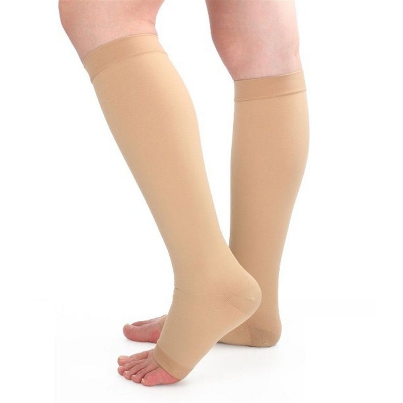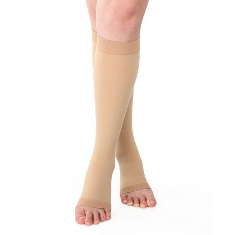 Runee Open Toe Compression Sock 20-30 mmHg Knee High Calf Support (L/XL, Beige)