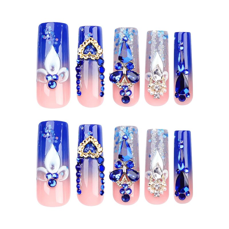 RUOKEXIN French Press on Nails Long Square Fake Nails Blue Acrylic False Nails with 5D Blue Rhinestones Charms Designs Gold Heart Charms Glitter Artificial Nails Luxury Stick on Nails for Women 24Pcs