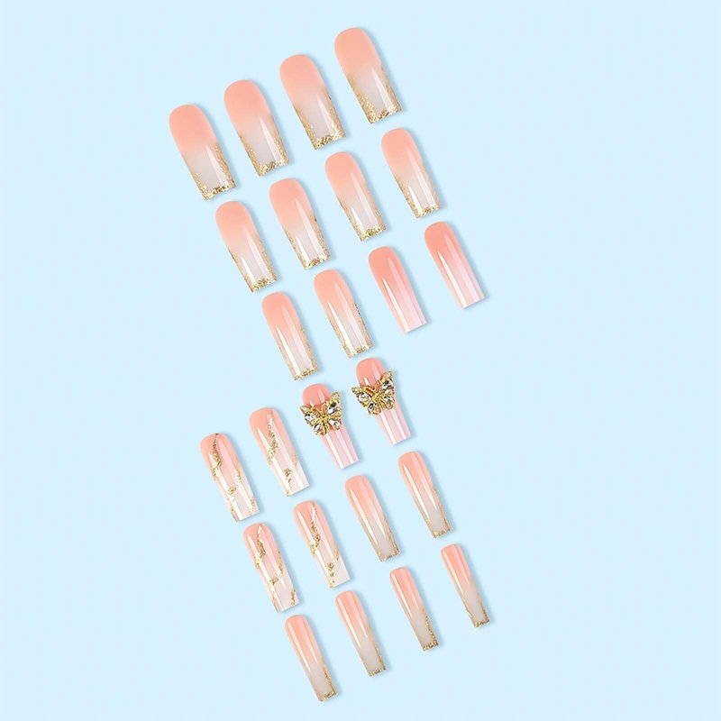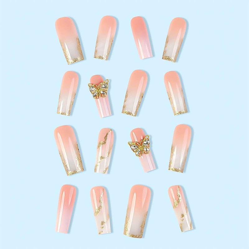 RUOKEXIN Nail Press ons Long Press on Nails Coffin Fake Fingernails Glossy Ombre Acrylic False Nails with 3D Butterfly Designs Gold Glitter Powder Artificial Nails Stick on Nails for Women 24Pcs