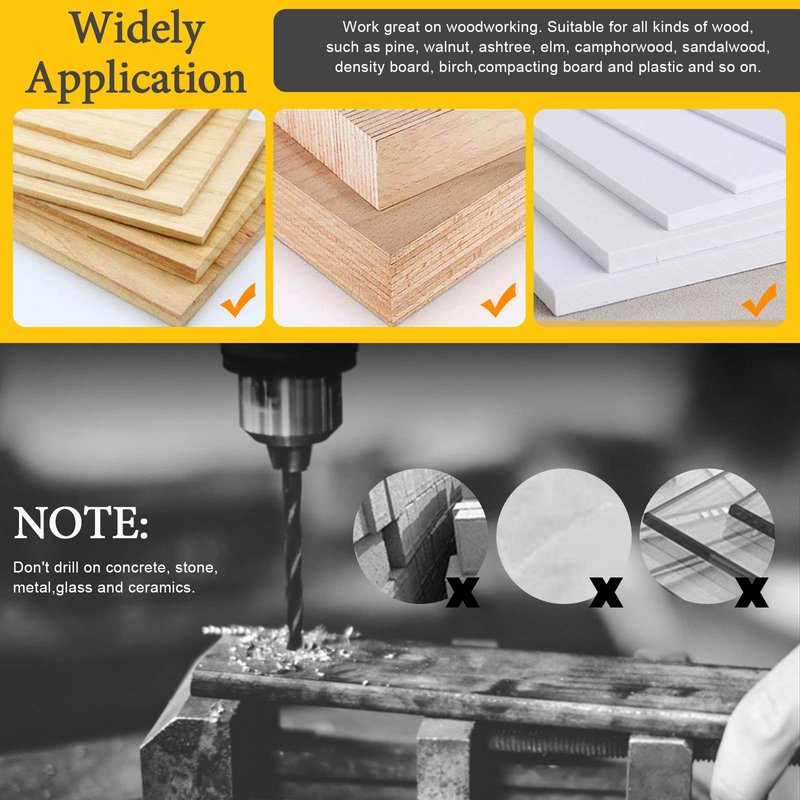 - ⚙️【Widely Application】Work great on woodworking. Suitable for all kinds of wood, such as pine, walnut, ashtree, elm, camphorwood, sandalwood, density board, birch,compacting board and plastic and so on. Compatible drill: Hand drill/rechargeable drill/bench drill. NOTE: pls don’t drill on concrete, stone, metal,glass and ceramics.