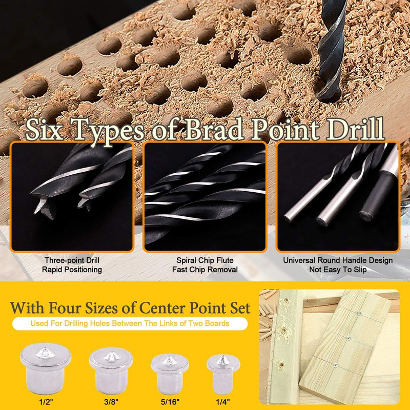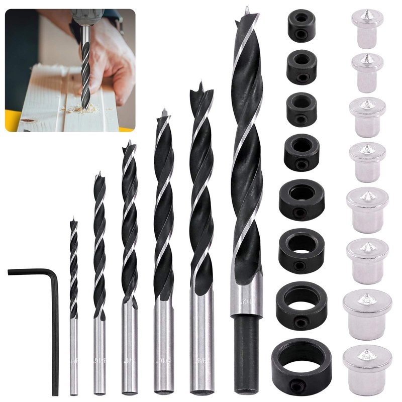 - ⚙️【What you Get】The fully drill bit kit contains 6 pcs brad point drill in 1/8’’, 3/16’’, 1/4’’, 5/16’’, 3/8’’, 1/2’’, 8 pcs center point set in 1/4’’ 5/16’’, 3/8’’, 1/2’’ (diameter), 8 pcs drill chuck in 1/8’’, 3/16’’, 1/4’’, 5/16’’, 3/8’’, 7/16’’, 1/2’’, 5/8’’ and 1 pcs hex key. In addition, offer reliable after-sale service, pls feel fee contact us for any dissatisfaction; We will reply you within 12 hour for your satisfaction.